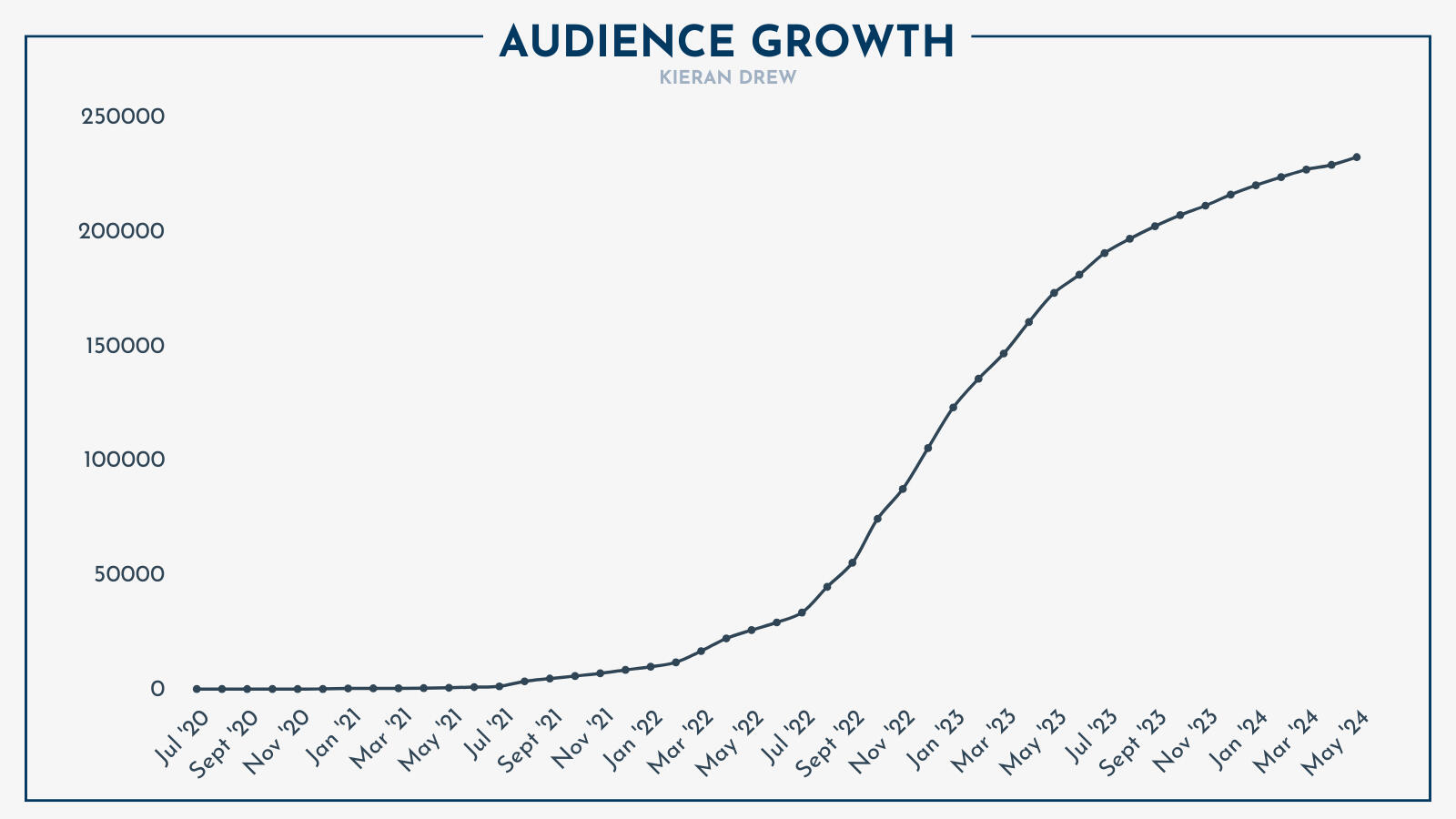"I went from beginner writer with no audience to 51,200 followers, 5,176+ newsletter subscribers, and a 6 figure online business within a year. I can safely say Kieran's systems have been my greatest investment.” — Parker Worth, Founder of StorySystem